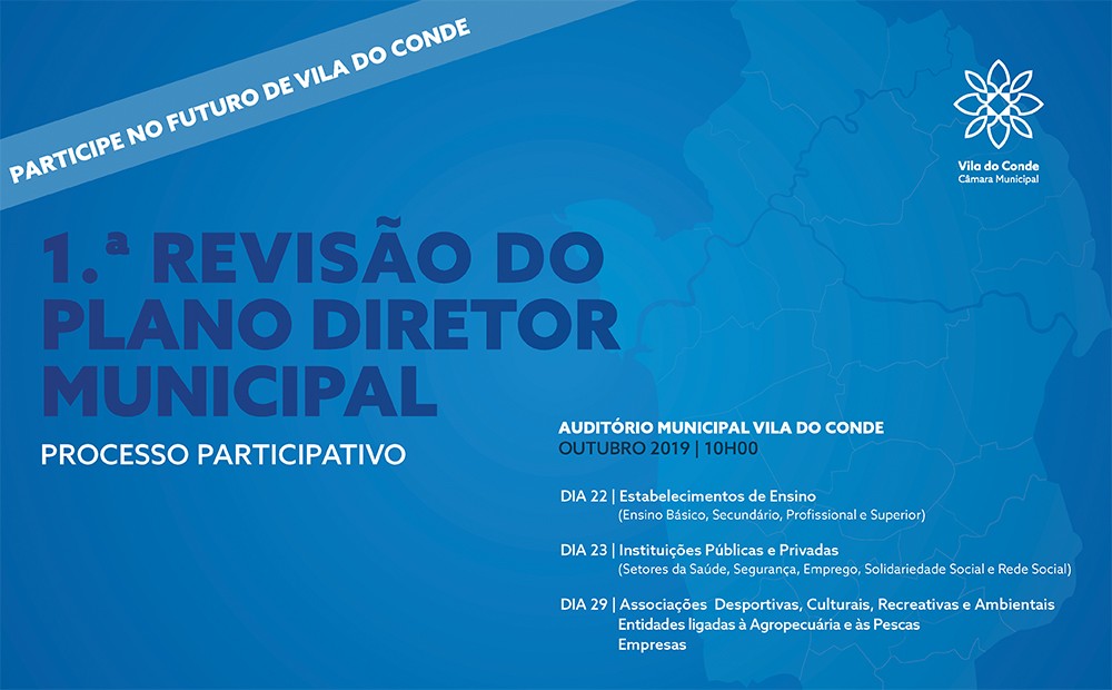 No âmbito da 1.ª Revisão do Plano Diretor Municipal (PDM) de Vila do Conde, a Câmara Municipal encontra-se a desenvolver um Processo Participativo, com todas as forças vivas do concelho, com o objetivo de dar a conhecer pormenorizadamente as alterações previstas, auscultar e recolher contributos que possam enriquecer o documento para posterior submissão à Discussão Pública.