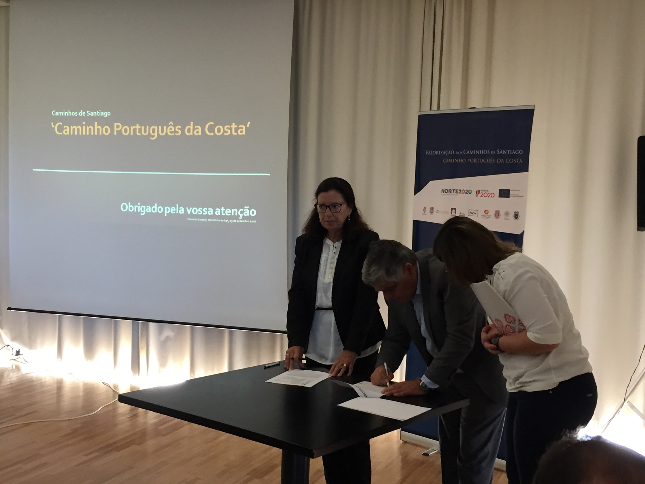 A Presidente da Câmara Municipal de Vila do Conde, Dr.ª Elisa Ferraz, esteve, ontem, na cerimónia de assinatura do termo de aceitação da candidatura “NORTE-04-2114-FEDER-000138 - Valorização dos Caminhos de Santiago - Caminho Português da Costa”. Na cerimónia também esteve presente o Vereador Dr. José Aurélio Baptista, bem como do Dr. Pedro Brochado de Almeida, técnico do município que tem desenvolvido este projeto em Vila do Conde.