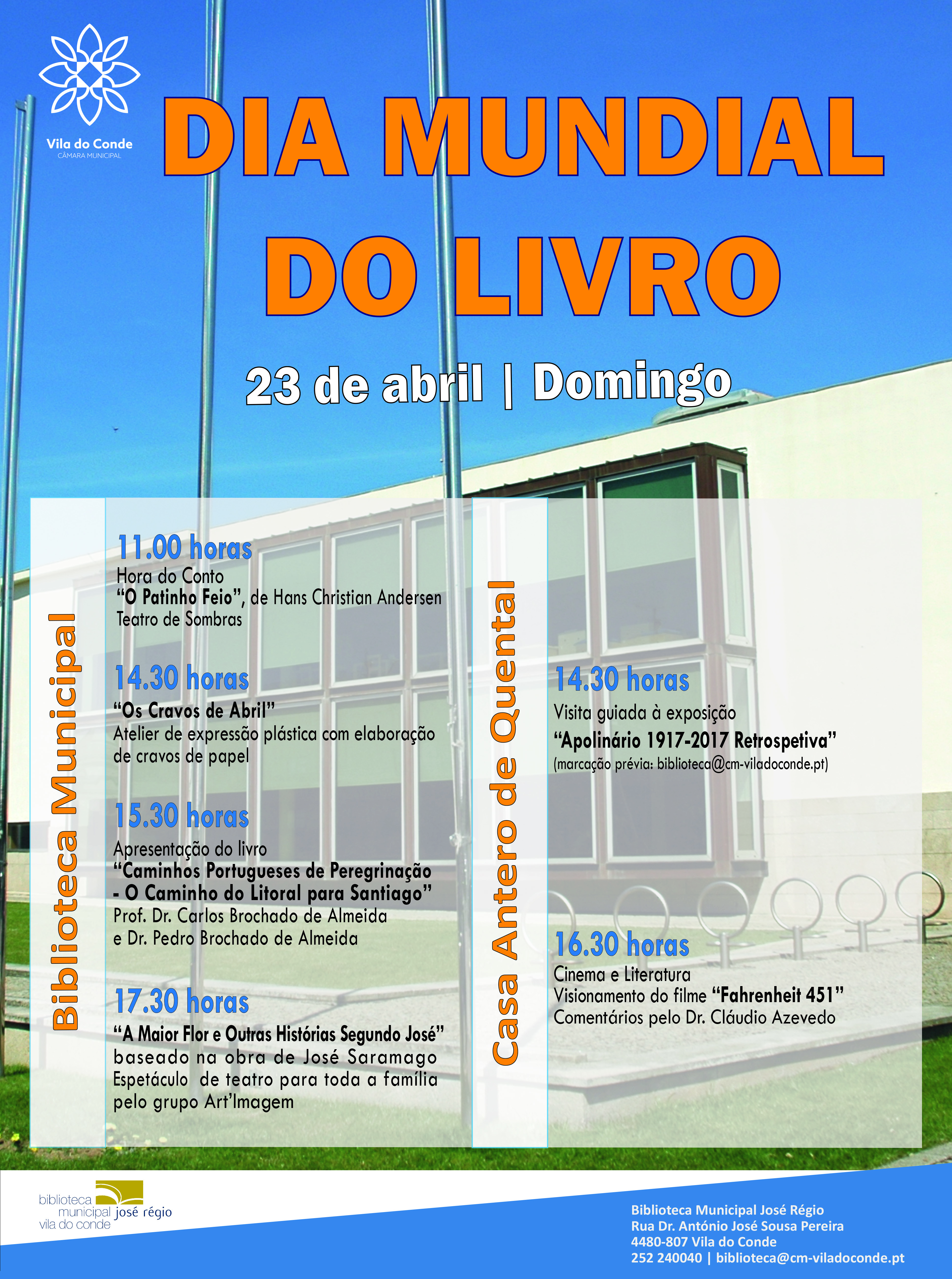 No próximo domingo, dia 23, celebra-se o Dia Mundial do Livro. Para assinalar esta data, a Biblioteca Municipal estará aberta entre as 10,30h e as 19h, disponibilizando todos os serviços como habitualmente. Foi ainda preparado um programa de atividades direcionado a todas as idades, contemplando ainda a casa Antero de Quental.