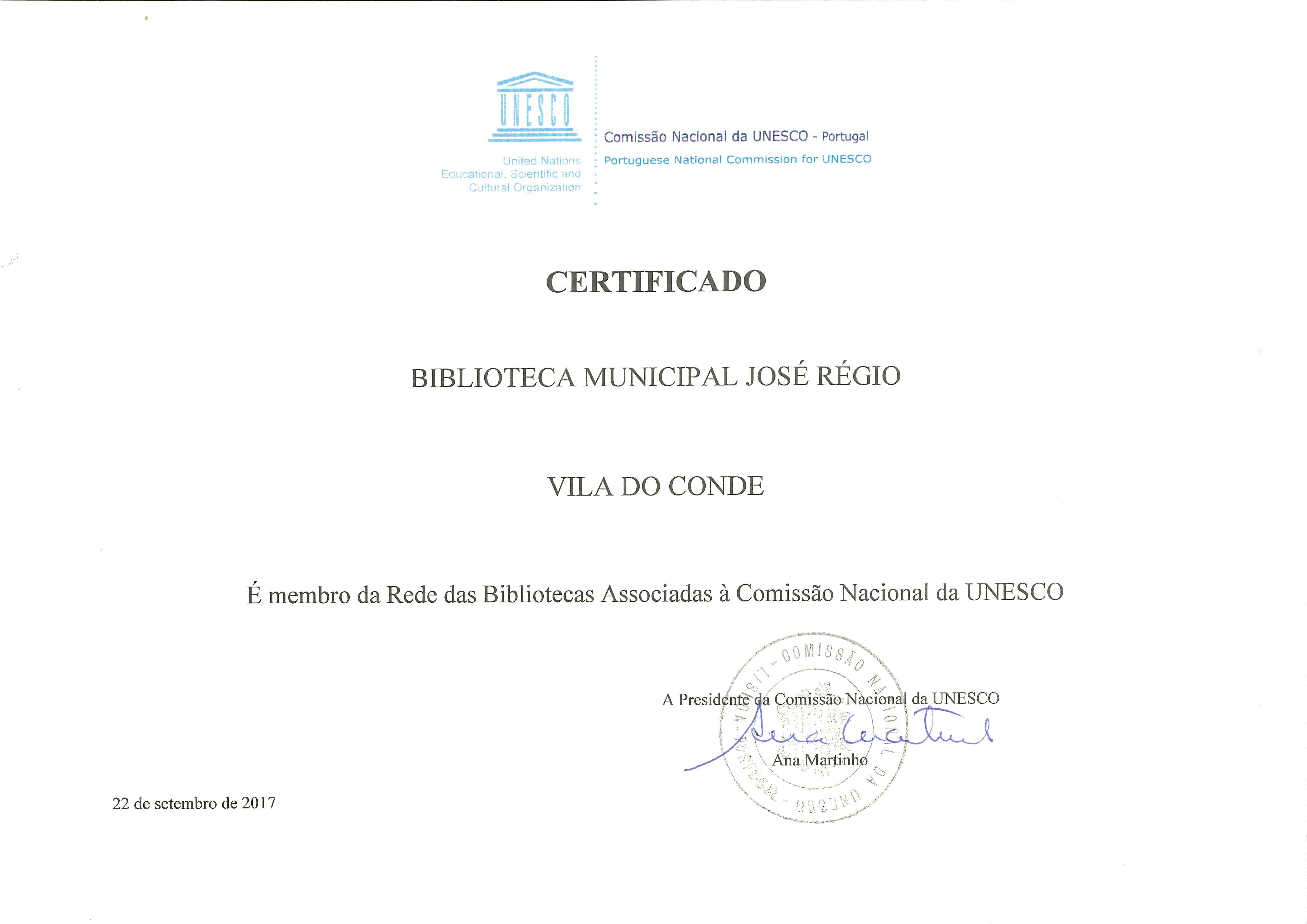 Biblioteca Municipal José Régio integra a Rede de Bibliotecas Associadas à Unesco O Manifesto da Unesco sobre Bibliotecas Públicas, publicado em 1994, é um documento orientador das bibliotecas públicas de todo o mundo. Nele se consigna a biblioteca como « porta de acesso local ao conhecimento - que fornece as condições básicas para uma aprendizagem contínua, para uma tomada de decisão independente e para o desenvolvimento cultural dos indivíduos e dos grupos sociais». Têm sido estes os objetivos da Biblioteca Municipal de Vila do Conde, os quais se têm concretizado através de um conjunto de ações que promovem a inclusão, a coesão social e a elevação dos indicadores de desenvolvimento humano.