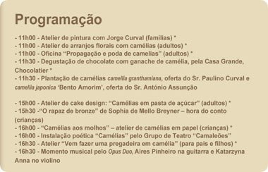 A efeméride tem início já esta sexta-feira, dia 20 de fevereiro, no átrio principal dos Paços do Concelho, com uma mostra de flores de camélias provenientes dos jardins de várias casas do Concelho de Vila do Conde. Às 21h00 no Centro de Memória - Centro de Pedagogia Ambiental – abre ao público a exposição fotográfica e documental “Camélias”, a que se segue uma conversa “A propósito de camélias”, com Paulino Curval – colecionador de camélias da Quinta Vilar de Matos, na Junqueira -, acompanhado pelo amigo António Assunção – também colecionador de camélias e viveirista, dos “Viveiros Flavius” em Guimarães – pela Presidente da Associação Nacional de Camélias, Dr.ª Eduarda Paz.
