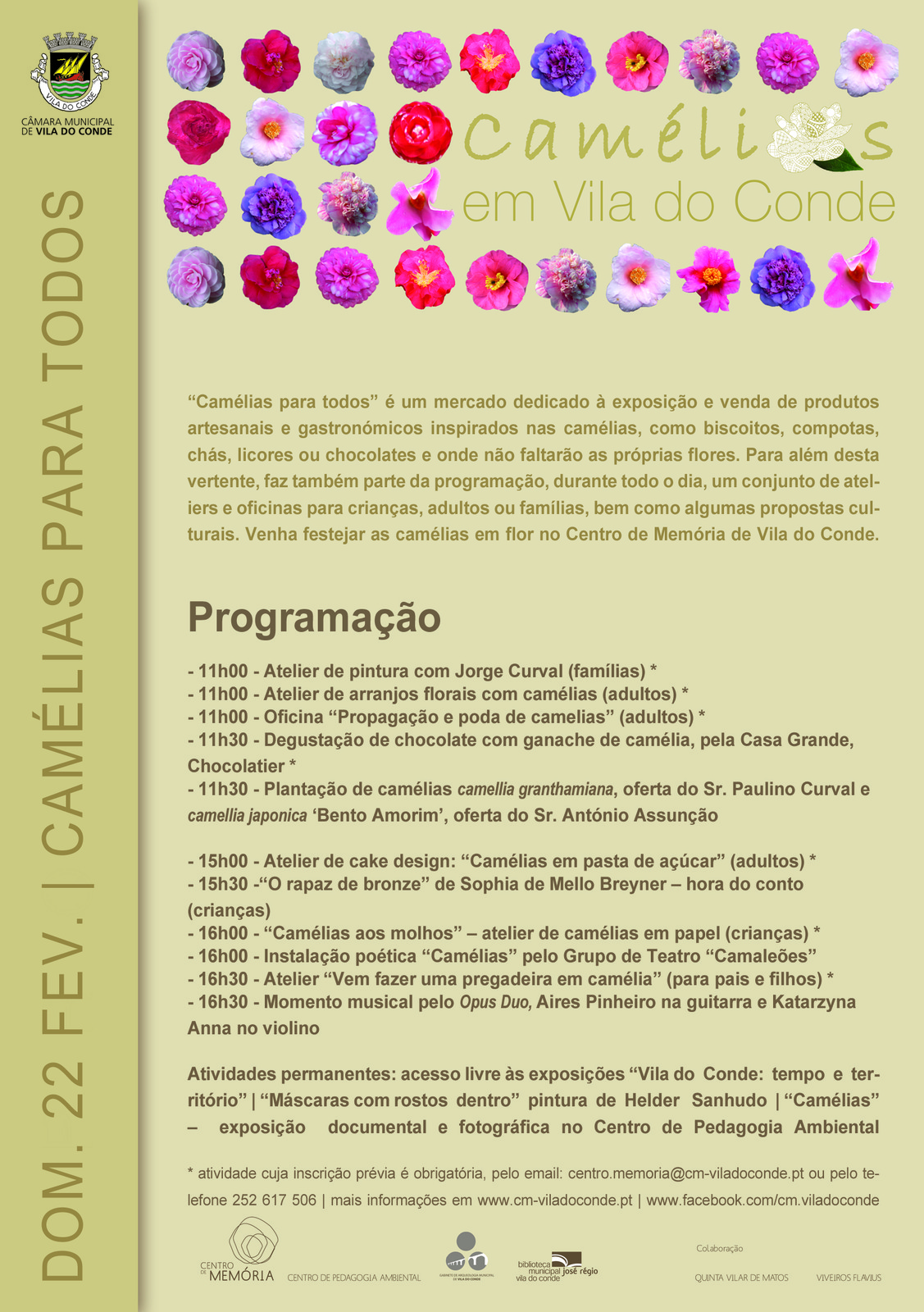 Ao longo do dia visite o mercado dedicado à exposição e venda de produtos artesanais e gastronómicos inspirados nas camélias, como biscoitos, compotas, chás, licores, chocolates, sabonetes, pregadeiras ou bijuteria e onde não faltarão as próprias flores. Simultaneamente, entre as 11h00 e as 18h00, um conjunto diversificado de ateliers e oficinas, subordinados à temática das camélias, bem como momentos de música e poesia compõe um interessante programa para toda a família. Os ateliers, para adultos, crianças ou famílias, são de inscrição prévia obrigatória. Destaque ainda para o momento da plantação de duas camélias no singular jardins do Centro de Memória.