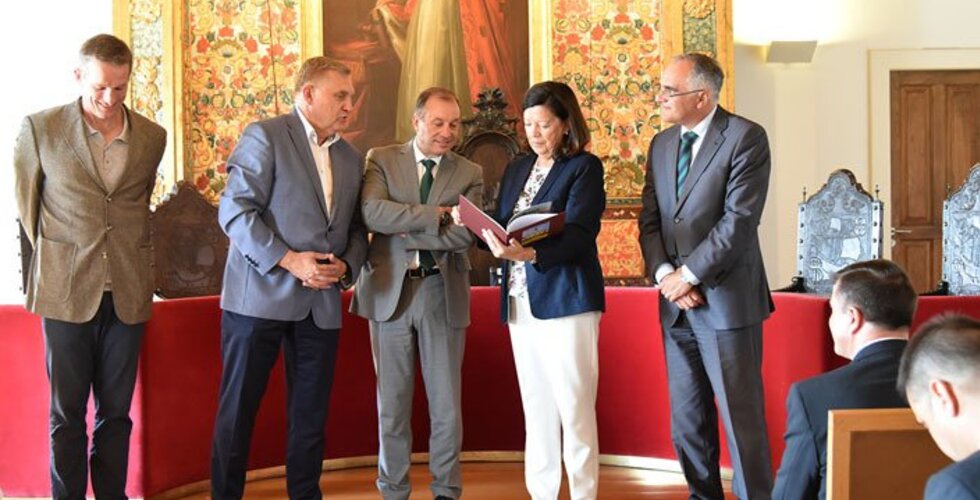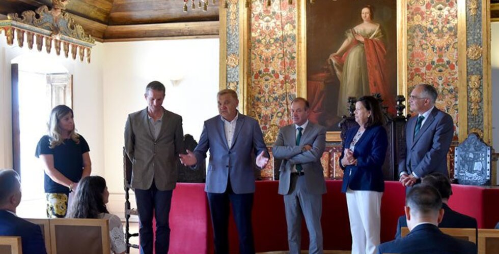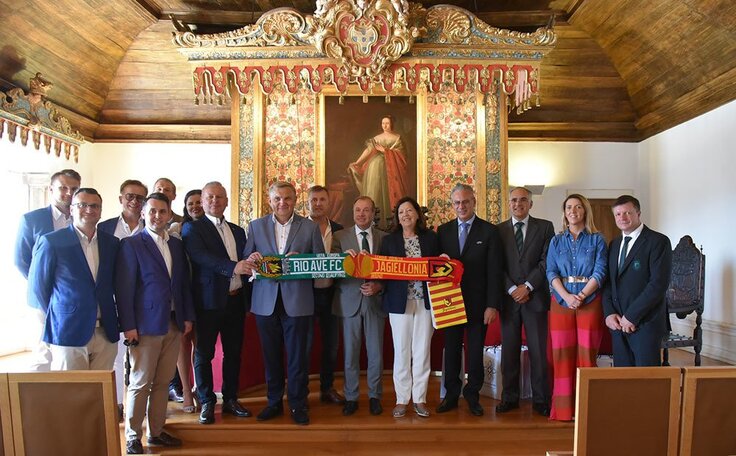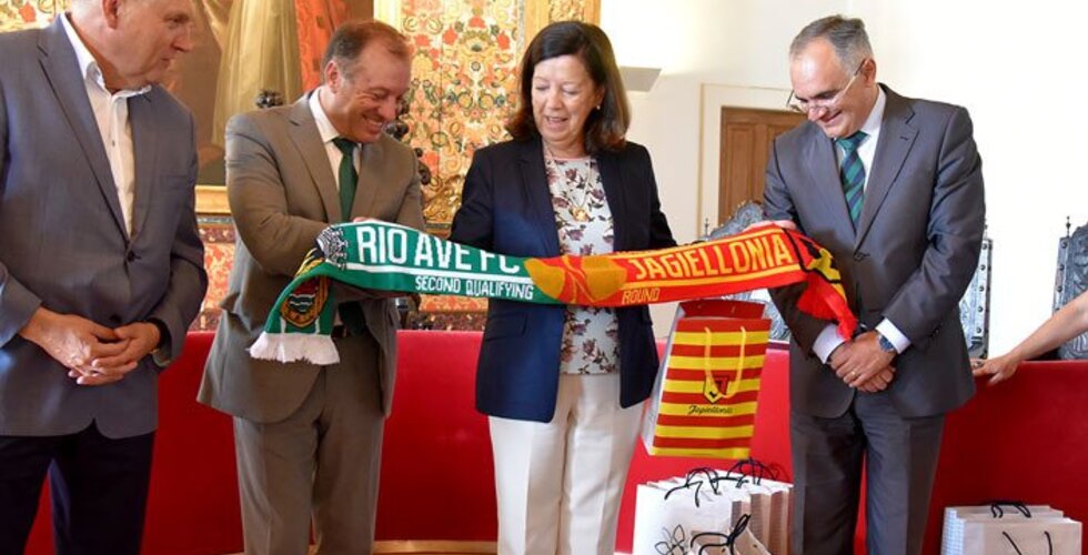 A Presidente de Câmara, Dr.ª Elisa Ferraz, acompanhada pelo Vereador do Desporto Dr. Pedro Gomes, recebeu uma delegação do clube polaco Jagiellonia de Bialystock, que defronta hoje o Rio Ave FC, no salão nobre dos Paços do Concelho, numa cerimónia de boas vindas e apresentação de cumprimentos.