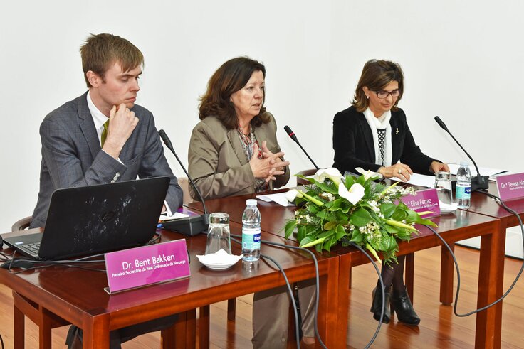 A abertura dos trabalhos foi feita pela Presidente da Câmara Municipal, Dr.ª Elisa Ferraz, acompanhada pela Vice-Presidente da CIG, Dr.ª Teresa Almeida e pelo Primeiro Secretário da Real Embaixada da Noruega, Dr. Bent Bakken.
