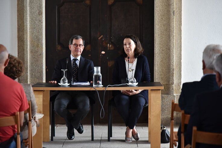 A sessão foi aberta pela Presidente da Câmara, Drª Elisa Ferraz, que manifestou o seu regozijo pela presença do orador que considera, pelo seu envolvimento no Centro de Estudos Anterianos, um amigo de Vila do Conde. A conferência iniciou-se fazendo alusão às diferentes aceções de Património: material, imaterial, paisagem cultural, paisagem natural e memórias vivas. Sublinhou, como aspeto ligado ao património imaterial do nosso Mosteiro, a Lenda da Berengária, uma alegoria que remete para a legitimação do poder, mas que pode funcionar como um bom exemplo junto dos elementos mais jovens para a perpetuação da memória da casa de religiosas. Evocou também a paisagem cultural vila-condense, na qual figura o litoral, com particular destaque para as praias que cativaram Antero de Quental . Aludiu ainda, na vertente do património imaterial, à presença de Vila do Conde na biografia de um significativo conjunto de nomes de criadores portugueses, como Antero, Guerra Junqueiro, Eça de Queiroz, Casal Delaunay, Eduardo Viana, Ruy Belo, José Régio, Julio- Saul Dias, Valter Hugo mãe, entre outros.