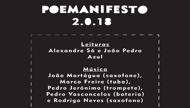 No próximo dia 9 de fevereiro, pelas 21h30, o Auditório Municipal apresenta o espetáculo “Poemanifesto”, uma performance poético-musical com interpretação dos atores Alexandre Sá e João Pedro Azul e a participação da Fanfarra Káustika, que irá brindar o público com um vasto e diversificado reportório de cariz étnico e cultural.