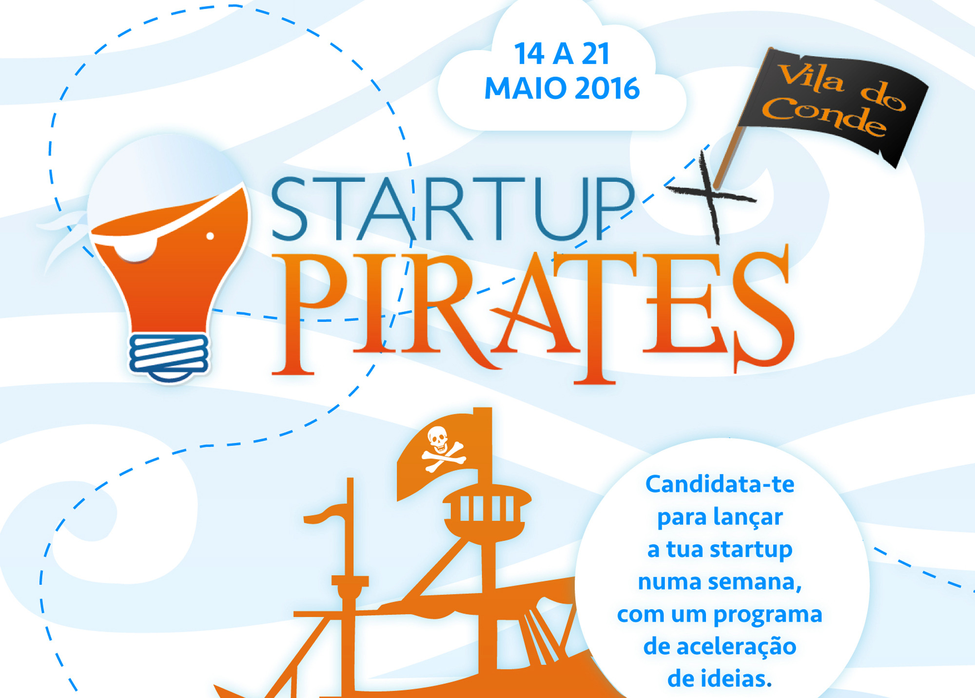 O Startup Pirates Vila do Conde realizar-se-á entre os dias 14 a 21 de Maio de 2016 e durante 8 dias, 30 participantes trabalharão nas suas ideias, contando com formação, workshops, mentoria e todas as condições de trabalho para que, no último dia, as possam apresentar a um painel de potenciais investidores.