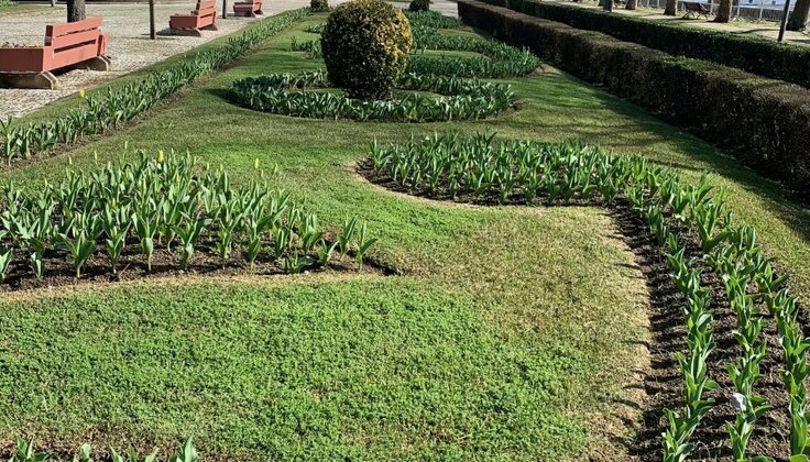 Os jardineiros municipais, ao longo do mês de dezembro e início de janeiro, plantaram manualmente, com dedicação e rigor, cerca de 60 mil bolbos de tulipas, de várias cores, vermelhas, amarelas e laranja, branco e lilás.