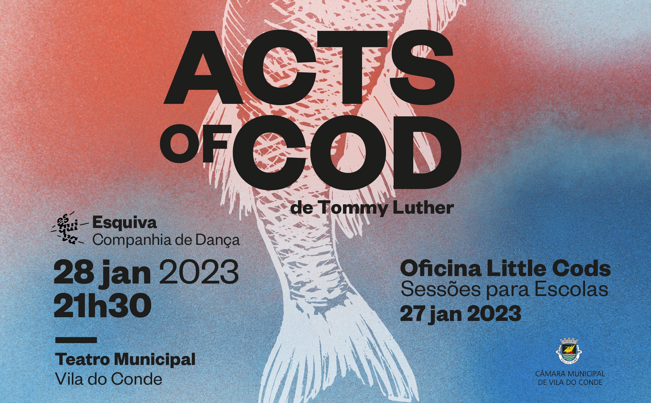 O Teatro Municipal de Vila do Conde apresenta no próximo dia 28 de janeiro, às 21h30, “Acts of Cod” de Tommy Luther, espetáculo pela Esquiva Companhia de Dança que conjuga teatro e dança para contar a história do bacalhau, desde a perspetiva do pescador e da sociedade à do próprio bacalhau, levando o espetador a explorar o impacto histórico, cultural e ambiental da pesca e do consumo deste peixe na humanidade e no mundo. O espetáculo é uma peça multidisciplinar, em que o teatro, a dança, o mimo, as marionetas o vídeo e a música constituem os seus principais meios de expressão.