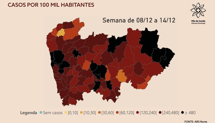 O concelho de Vila do Conde baixou do nível de risco extremamente elevado para o nível de risco muito elevado, na semana de 8 a 14 de dezembro.