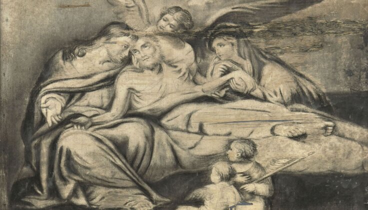 Desenho a grafite sobre seda com a representação de São José no leito da sua morte, ladeado e amparado por Jesus Cristo e a Virgem Maria, com a presença de anjos, num primeiro plano, anjos-meninos, e por detrás de São José, um anjo de asas abertas e dois querubins envoltos numa nuvem branca.
