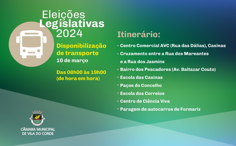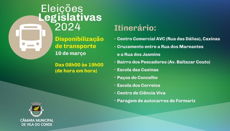 A Câmara Municipal de Vila do Conde disponibiliza, durante o próximo domingo, dia 10 de março, transporte gratuito para os cidadãos poderem exercer o direito ao voto, nas eleições legislativas de 2024.