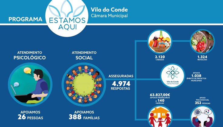 Porque ser solidário é ajudar, olhar em volta e colmatar dificuldades, a Câmara Municipal de Vila do Conde, no sentido de fazer frente a esta pandemia que abruptamente nos invadiu, implementou numa articulação estreita com as instituições, empresas e sociedade civil, o Programa Solidário ESTAMOS AQUI, com abrangência alargada, desde as instituições, às famílias.