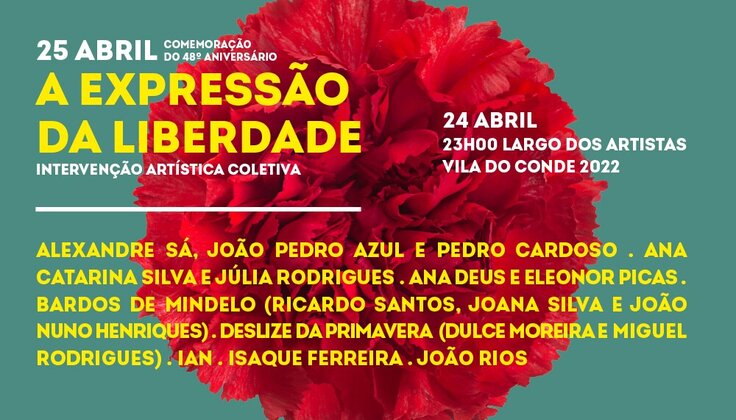 No âmbito das comemorações do 48º aniversário do 25 de Abril, realiza-se no próximo domingo, dia 24 de abril, às 23h00, no Largo dos Artistas, a Intervenção Artística Coletiva intitulada “A Expressão da Liberdade”, seguida da entoação da canção “Grândola, Vila Morena”.