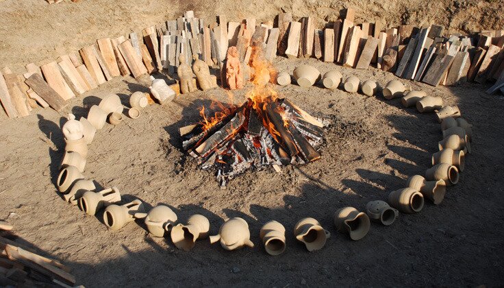 No final o forno foi desfeito e as peças cozidas são removidas e arrefecidas. Como este tipo de forno promove uma cozedura redutora, pobre em oxigénio, as peças adquirem uma cor cinzenta escura.