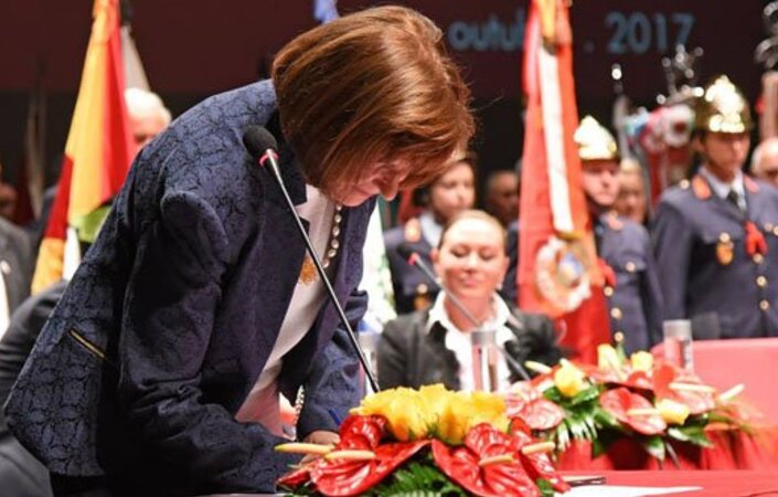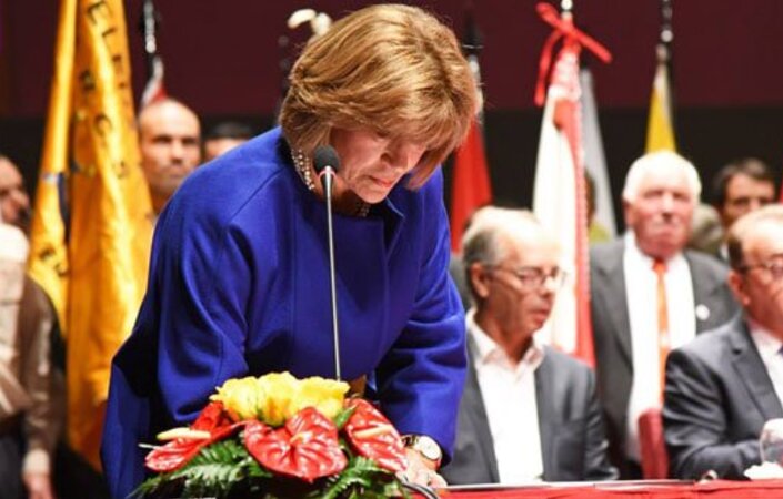Depois de terem prestado juramento, e assinado a ata de posse, os 9 membros do Executivo Municipal, e os 48 Deputados Municipais (27 eleitos, mais os 21 Presidentes de Junta, por inerência), usou da palavra a reeleita Presidente da Câmara, Dra. Elisa Ferraz, que começou por evocar a memória do seu marido, Dr. José Luís Ferraz, recentemente falecido, e agradecer o apoio da sua família no projeto político que decidiu fundar e desenvolver.