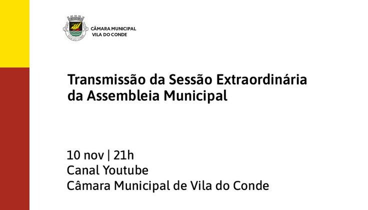 A Sessão Extraordinária da Assembleia Municipal agendada para esta quinta-feira, dia 10 de novembro, às 21h00, será transmitida em direto através do canal de youtube da Câmara Municipal (https://www.youtube.com/channel/UCM99ntWg9IGTX6sZ4H5Lcnw).